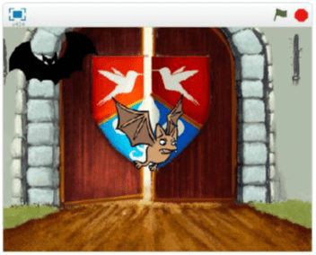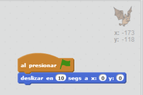 Primer paso: En primer lugar vamos a programar a nuestro murciélago para que se deslice por el escenario durante 10 segundos hasta alcanzar su centro. Para ello utilizamos el siguiente bloque.