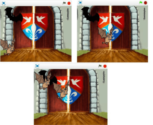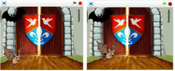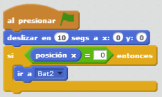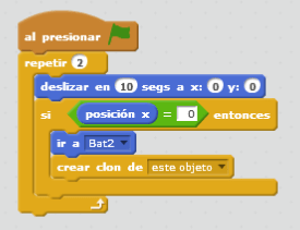 Segundo paso: Ahora programaremos al murciélago para que una vez alcanzada la posición central vaya directamente a la posición del otro murciélago. Para ello mantenemos el bloque anterior y añadimos un bloque de control que nos indique que si la posición x del objeto es igual a cero, este tiene que ir a la posición del otro murciélago.